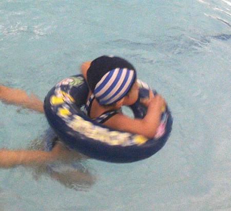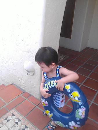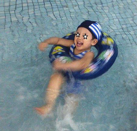 這天,媽媽我就全程陪伴兒子泡水~而且因為游泳圈買得比較大,也不是有底的那種,所以要很小心地扶著他的腰~
