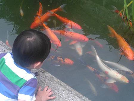 花園裡有個錦鯉池,包寶最愛魚了~看不到小鯨魚,還有錦鯉可以陪他~